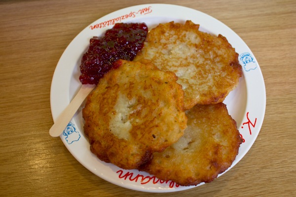 My favourite food at the Nuremberg Christmas market would have to be the kartoffelpuffers which are kind of like hash browns. They are typically served with applesauce but I had cranberry sauce hoping it would be like what you find in Austria. It wasn’t. Don’t make the mistake of thinking these are vegetarian as they are cooked in a fairly significant amount of lard (pig fat).