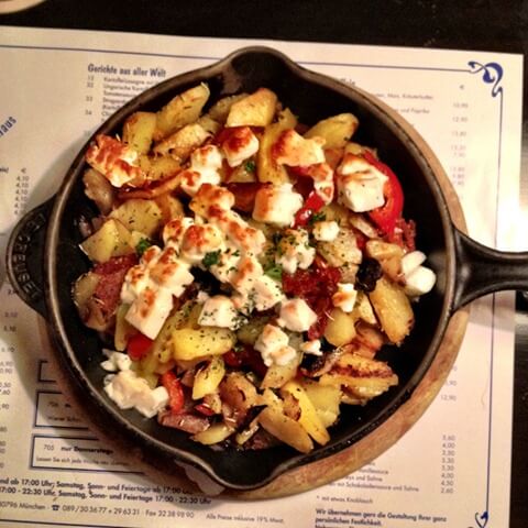 Kartoffelhaus is a fun place to eat if you’re going to be in Munich. We were there on a weekend night and it was fairly busy so you might want to make a reservation on the weekends. It’s located in Schwabing West, a popular residential area in Munich, and it’s right opposite the Hohenzollernplatz metro station so it’s very easy to get to. Munich Kartoffelhaus is a must for potato lovers and I definitely recommend ordering the Greek potatoes with feta!